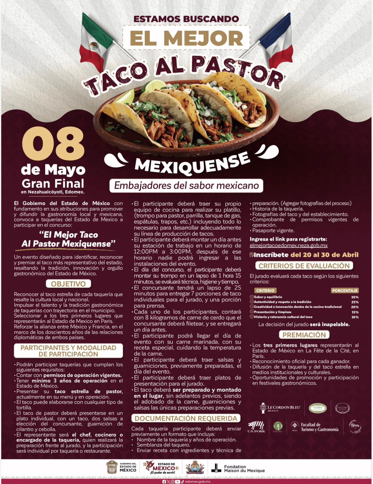 Estamos buscando el mejor taco al pastor mexiquense 8 de mayo gran final, inscribete del 20 al 30 de abril Sociales 1,764 vistas Abril 19, 2026 20:33 hrs. Sociales › Luciano Tapia › Portal Mexiquense.com.mx Ver más Escríbe al autor Escribe un comentario directo al autor Nombre Correo Mensaje Enviar mensaje al autor Sígue al autor facebook.com/PortalMexiquenseOficial/